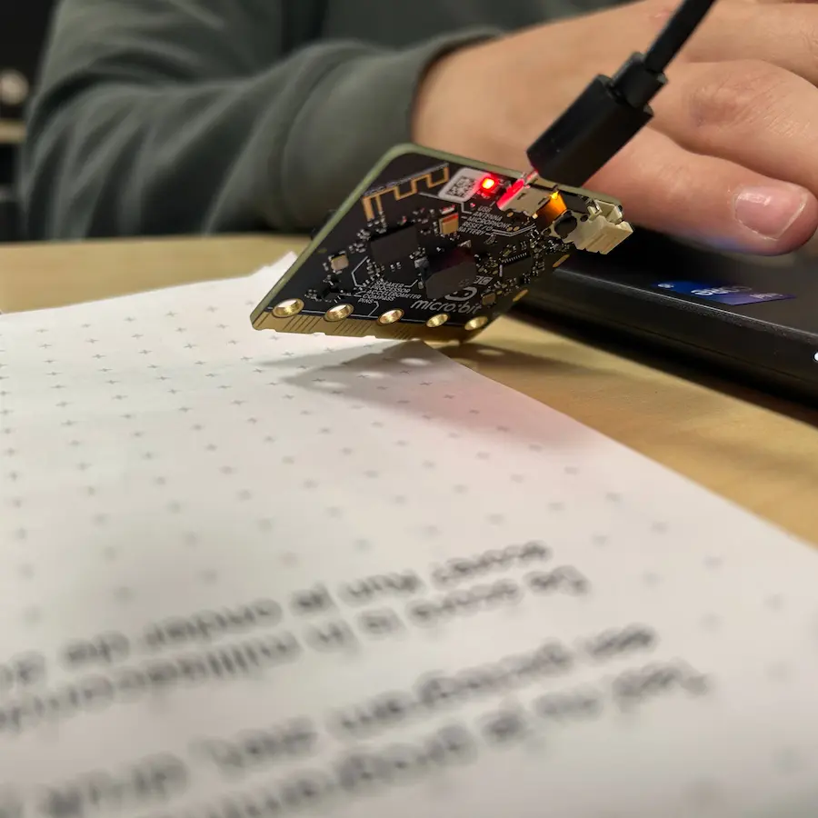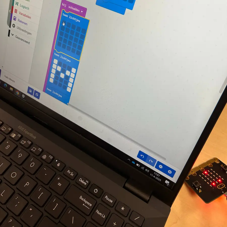 Elke leerling ontvangt een micro:bit van ons, die ze kunnen verbinden met hun eigen computer. Via een online omgeving kunnen ze de micro:bit programmeren. Dit gebeurt door middel van programmeren in blokken, zoals bij Scratch.